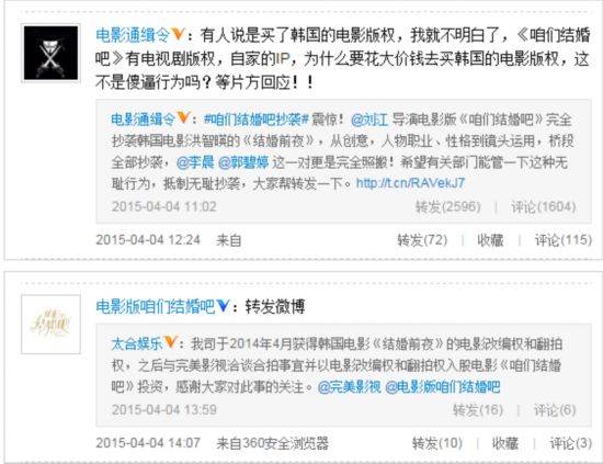 对于抄袭的质疑,太合娱乐官微回应:“我司于2014年4月获得韩国电影《结婚前夜》的电影改编权和翻拍权,之后与完美影视洽谈合拍事宜并以电影改编权和翻拍权入股电影《咱们结婚吧》投资,感谢大家对此事的关注。”