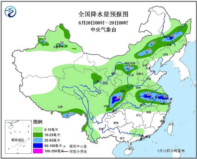 6月28日08时至29日08时,新疆伊犁河谷和沿天山地区,内蒙古东部、东北地区西部、四川盆地中北部、江淮、江南北部等地有中到大雨,其中,四川盆地北部、河南东南部、安徽中部、江苏南部、浙江北部、上海等地的部分地区有暴雨,局地有大暴雨(100~130毫米);上述局部地区还将伴有短时强降水、雷暴大风等强对流天气。