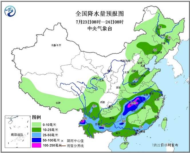 23日08时至24日08时,黑龙江西部、吉林北部、辽宁西部、内蒙古东南部、华北南部、黄淮北部、江淮大部、江汉南部、江南北部、华南大部、贵州南部、云南、川西高原南部等地有中到大雨,其中安徽西南部、湖北东部、湖南北部、江西西北部、广西北部、云南西部和东南部的部分地区有暴雨,局地大暴雨(100~140毫米);上述局部地区还将伴有短时强降水、雷暴大风等强对流天气。