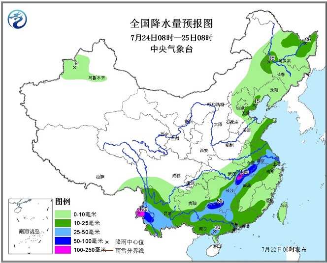 24日08时至25日08时,辽宁西南部、吉林西部、黑龙江北部、天津、黄淮东部、江淮大部、江南中西部和北部、华南大部、云南大部等地有中到大雨,其中,湖北东南部、安徽西南部、湖南西南部、江西西北部、广西北部、云南西部等地的部分地方有暴雨,局部大暴雨(100~120毫米);上述局部地区还将伴有短时强降水、雷暴大风等强对流天气。