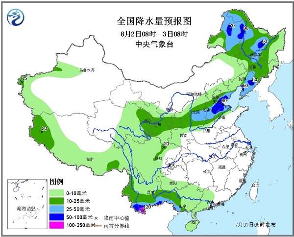 8月2日08时至8月3日08时,内蒙古东部、东北大部、华北中南部、西北东部、四川盆地西北部、广西西部、云南中南部、西藏西南部等地有中到大雨,其中,内蒙古东部、黑龙江中部、辽宁中部、河北中东部、天津以及云南南部等地的部分地区有暴雨,局地有大暴雨(100~120毫米);上述局部地区还将伴有短时强降水、雷暴大风等强对流天气。