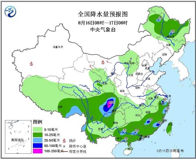 8月16日08时至17日08时,内蒙古东北部、东北地区北部、江南东部、华南大部、四川大部、重庆西部、云南西部和南部、西藏东部等地的部分地区有中到大雨,其中,四川盆地中部有暴雨或大暴雨(100~180毫米);此外,江西南部等地有分散性暴雨;上述局部地区还将伴有短时强降水、雷暴大风或冰雹等强对流天气。内蒙古西部、甘肃中部等地的部分地区有4~6级风,南疆盆地、内蒙古西部有扬沙或浮尘天气。
