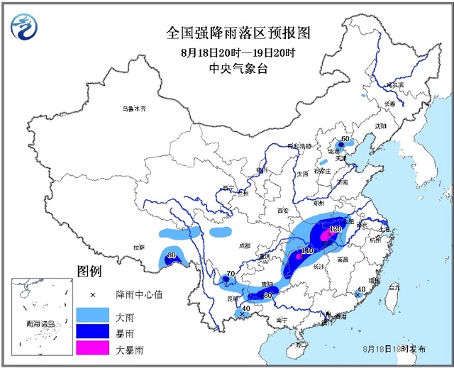 受西南涡东移影响,预计18日夜间至20日,重庆东部、贵州中南部、湖北、湖南北部、河南中南部、安徽中北部、江苏中南部等地自西向东将有一次强降水过程,上述地区有大到暴雨,局地大暴雨(日雨量100~140毫米);另外,受高原切变线和冷空气南下影响,西藏东部、川西高原、云南等地将有一次中到大雨,局地暴雨的降水过程;上述局部地区并伴有短时强降水(小时雨强40~60毫米)、雷暴大风等强对流天气。为此,中央气象台8月18日18时继续发布暴雨蓝色预警。