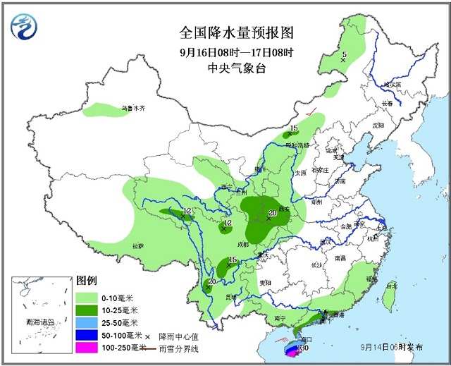 16日08时至17日08时,青海东部和南部、西北地区东部、内蒙古中东部、西藏中东部、西南地区大部、海南、华南中南部等地有小到中雨,其中,海南、广东西南部沿海等地的部分地区有大雨或暴雨,海南南部局地有大暴雨(100~130毫米);上述局地还将伴有短时强降水等强对流天气。