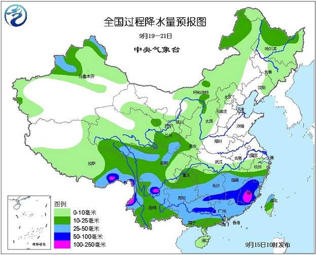 19-21日,江南、华南及西南地区东部有中到大雨,局部暴雨。此外,新疆北部、华北西部、东北地区北部和东部等地有小到中雨。