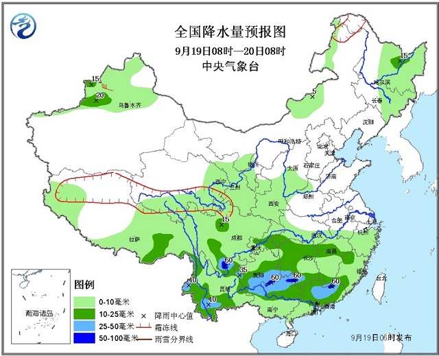 19日08时至20日08时,新疆北部、内蒙古东部、东北地区中东部、西北地区东部、青藏高原东部和西南部、西南地区、华北西南部、江汉南部、江南、华南等地有小到中雨,其中,云南西南部、川西高原南部、贵州南部、湖南西南部、广西北部、广东北部、江西南部等地的部分地区有大雨,局地暴雨(50~60毫米),上述部分地区并伴有雷暴、短时强降水等强对流天气。新疆北部有4~6级风。