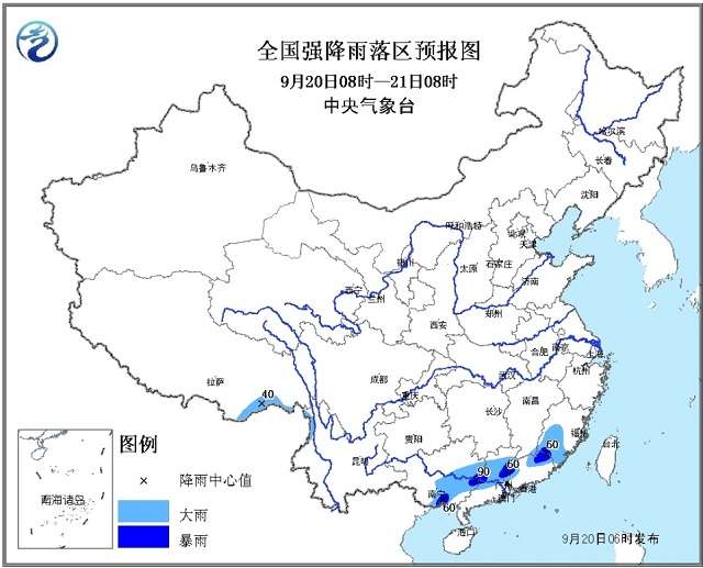 受东移高原槽和低层切变线共同影响,20日,华南、江南东南部等地有一次中到大雨的降水过程,其中,广西中南部、广东中北部、福建南部等地的局部地区有暴雨(日雨量50~90毫米),上述局部地区还将伴有雷暴、短时强降水等强对流天气。中央气象台9月20日06时继续发布暴雨预报。