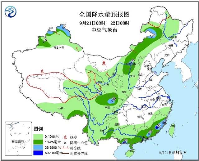 9月21日08时至22日08时,新疆北部、内蒙古中东部、东北地区西北部、西藏中东部、西北地区中东部、西南地区大部、江南中南部、华南等地有小到中雨,其中,新疆北部、内蒙古中东部、四川东北部、广西南部、广东南部、福建南部等地的部分地区有大雨或暴雨(50~70毫米)。上述局部地区还将伴有雷暴、短时强降水等强对流天气。